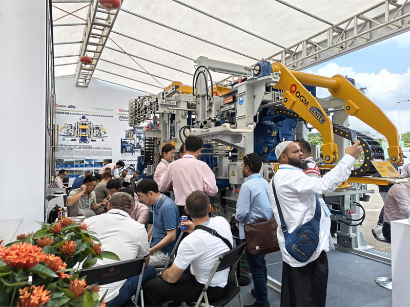 कँटन फेअर दरम्यान, QGM ने 12.0 C21-24 घराबाहेर आणि 20.1 K11 बूथवर दुहेरी प्रदर्शन आयोजित केले. कंपनीने तिचे ZN1000-2C पूर्णपणे स्वयंचलित वीट बनवण्याचे मशीन, एक प्रातिनिधिक हाय-एंड काँक्रीट ब्लॉक बनवणारे मशीन हायलाइट केले. प्रगत चीनी आणि जर्मन तंत्रज्ञान एकत्रित करून, हे मशीन उच्च कार्यक्षमता, उच्च सुस्पष्टता, कमी ऊर्जा वापर आणि बुद्धिमान तंत्रज्ञान यांसारखे उत्कृष्ट फायदे मिळवून देते, जे बुद्धिमान उत्पादन आणि ग्रीन बिल्डिंग मटेरियल उपकरणांमध्ये QGM चे अग्रगण्य स्थान पूर्णपणे प्रदर्शित करते.