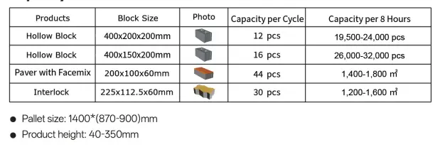 उपकरणे विविध प्रकारच्या पोकळ विटांची उत्पादने तयार करतात, ज्यामध्ये सामान्य ब्लॉक्स, डेकोरेटिव्ह ब्लॉक्स आणि इन्सुलेटिंग ब्लॉक्स सारख्या अनेक कार्यात्मक प्रकारांचा समावेश होतो. छिद्रांच्या आकारांमध्ये चौरस आणि गोल छिद्रांचा समावेश होतो आणि व्यवस्थेमुळे एकल-पंक्ती, दुहेरी-पंक्ती आणि बहु-पंक्ती भोक संरचना प्राप्त होऊ शकते. साचा बदलून किंवा उपकरणे पॅरामीटर्स समायोजित करून, विविध प्रकारच्या वीट उत्पादनांना बाजारपेठेच्या विविध मागण्या पूर्ण करण्यासाठी लवचिकपणे स्विच केले जाऊ शकते.