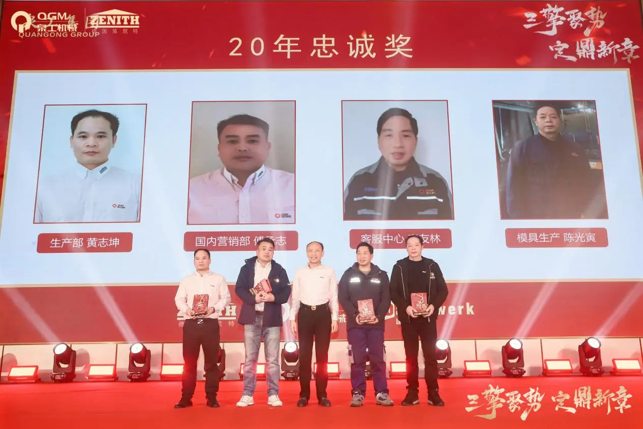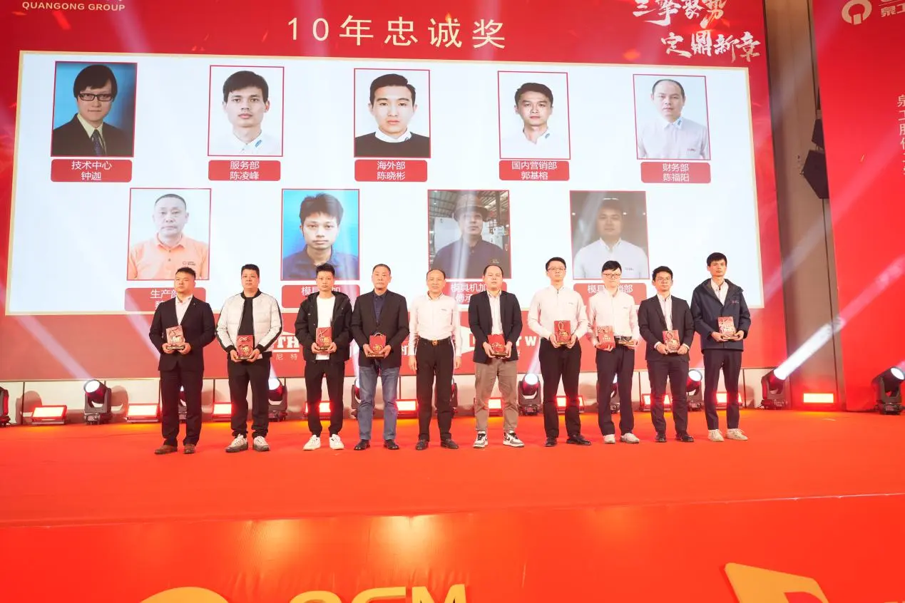 वार्षिक सभेदरम्यान, 10-वर्ष, 20-वर्ष आणि 30-वर्षीय निष्ठा पुरस्कारांसाठी एक भव्य पुरस्कार सोहळा देखील आयोजित करण्यात आला होता. कंपनीसोबत हातात हात घालून चाललेल्या आणि एकत्र वाढलेल्या कर्मचाऱ्यांचा एक गट स्टेजवर पोहोचला, क्वांगॉन्ग मशिनरी कं, लि.च्या स्थिर विकासाचा आणि त्याच्या टिकाऊ कॉर्पोरेट संस्कृतीचा भक्कम पाया पूर्णपणे प्रदर्शित केला.